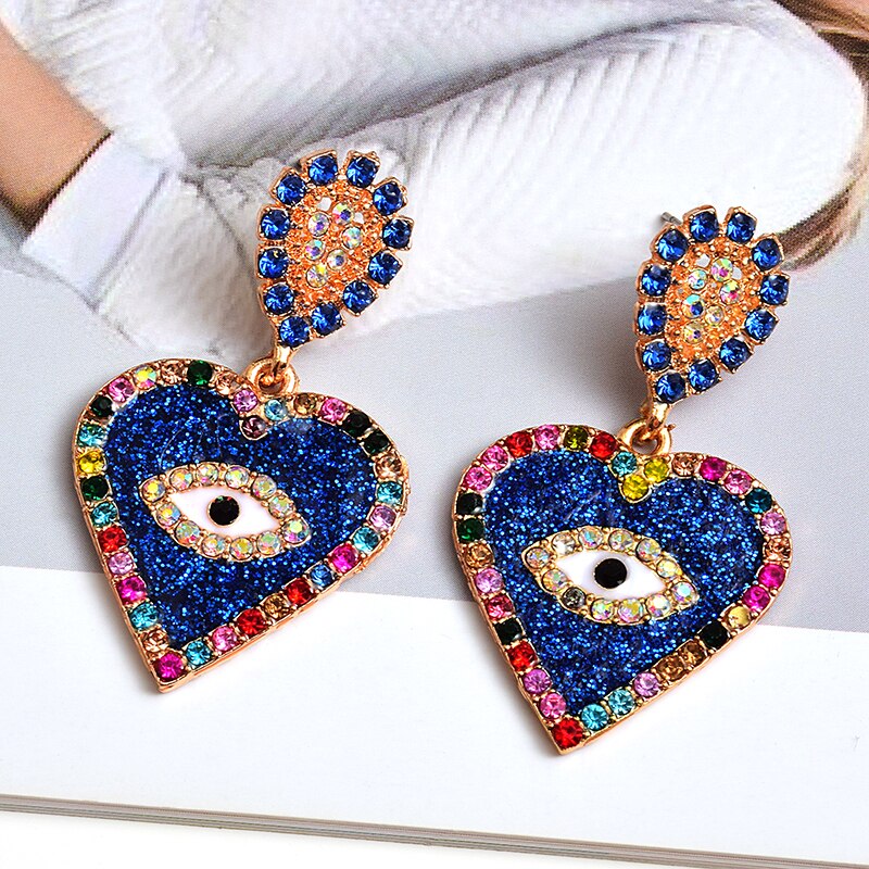 Get the perfect accessory to compliment your outfit and make a huge statement. These eye heart earrings are perfect for the festival season! These dazzling earrings are made from zinc alloy and heavily embellished in rhinestones. Available in blue and purple.