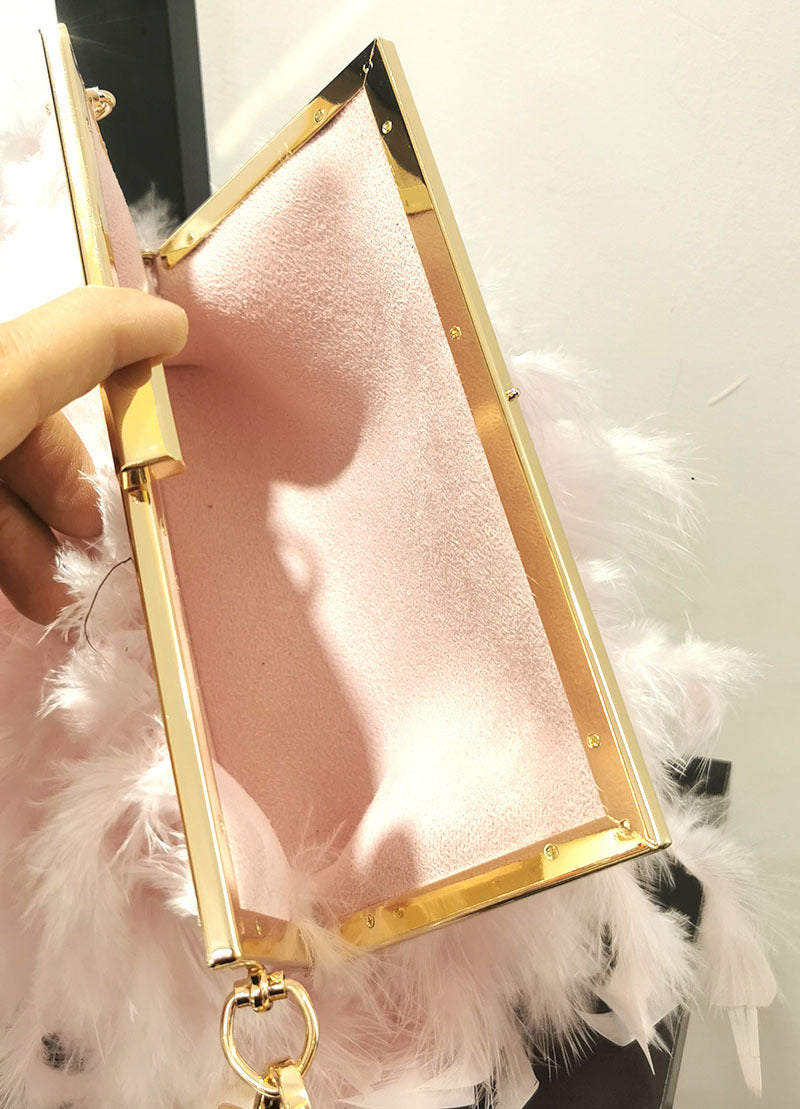 Each bag arrives with the choice of two types of handles; a chain and "pearl" effect to transform the clutch bag into a handbag or shoulder bag.