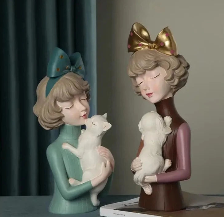 Introducing our 'Girl Holding Kitten Ornament', made from high-quality resin. Lovely gift for cat owners. Features a young girl lovingly holding her kitten with a smiling facial expression, wearing a large green bow. Perfect as a table ornament.