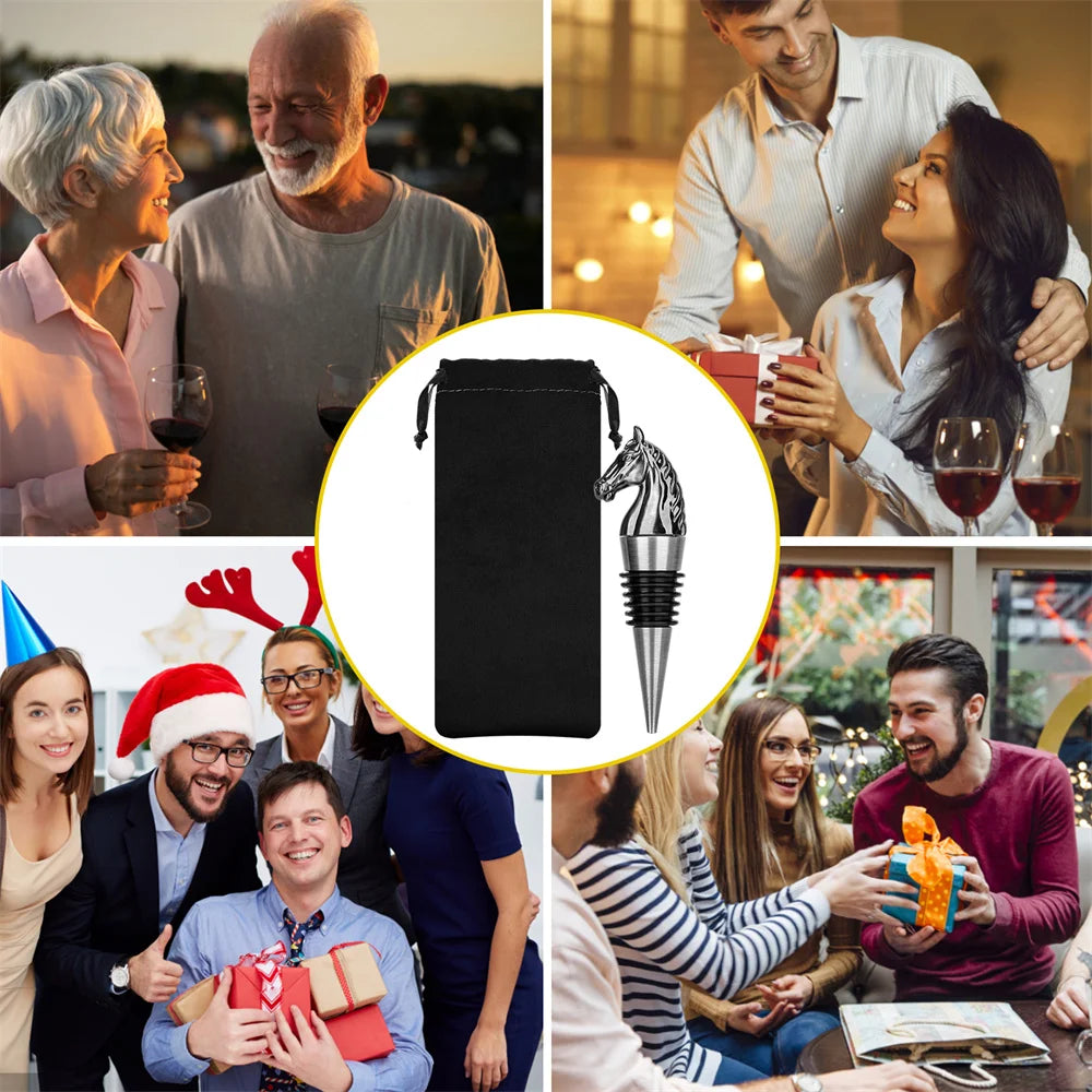 Our exquisite Horse Wine Stopper is a must-have for wine enthusiasts. Crafted from premium zinc alloy, it's available in stunning silver or radiant bronze finishes. The intricately detailed horse's head atop adds charm, while the silicone cork screw ensures a tight seal. It's not just functional, but also a lovely gift option, complete with a velvet pouch for elegant presentation.