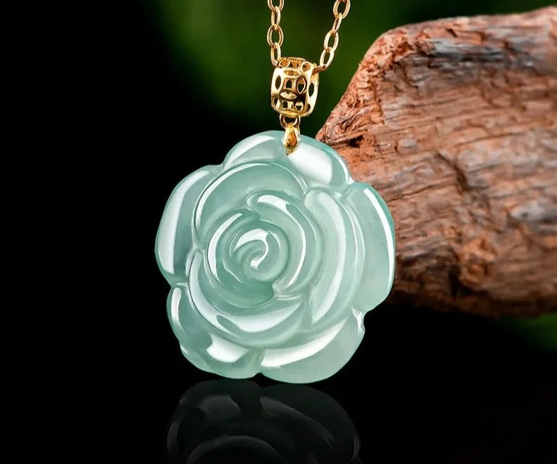 Dive into the enchanting world of our Jade Rose Necklace, where nature's beauty meets timeless elegance! This captivating piece features a green rose pendant meticulously carved from natural crystal jade, symbolizing harmony, eternity, and virtue. Adorned with an 18k gold-plated pendant hook and chain, it exudes luxury and refinement.