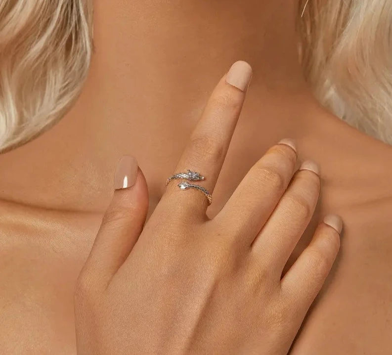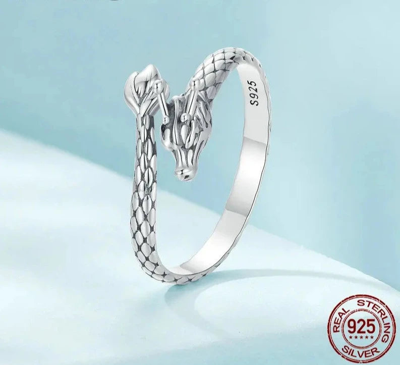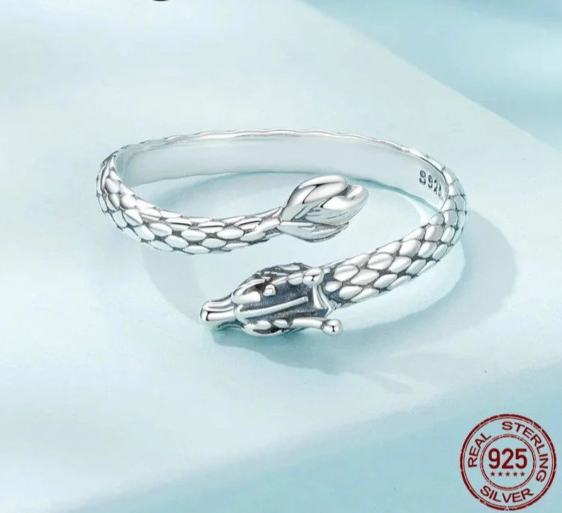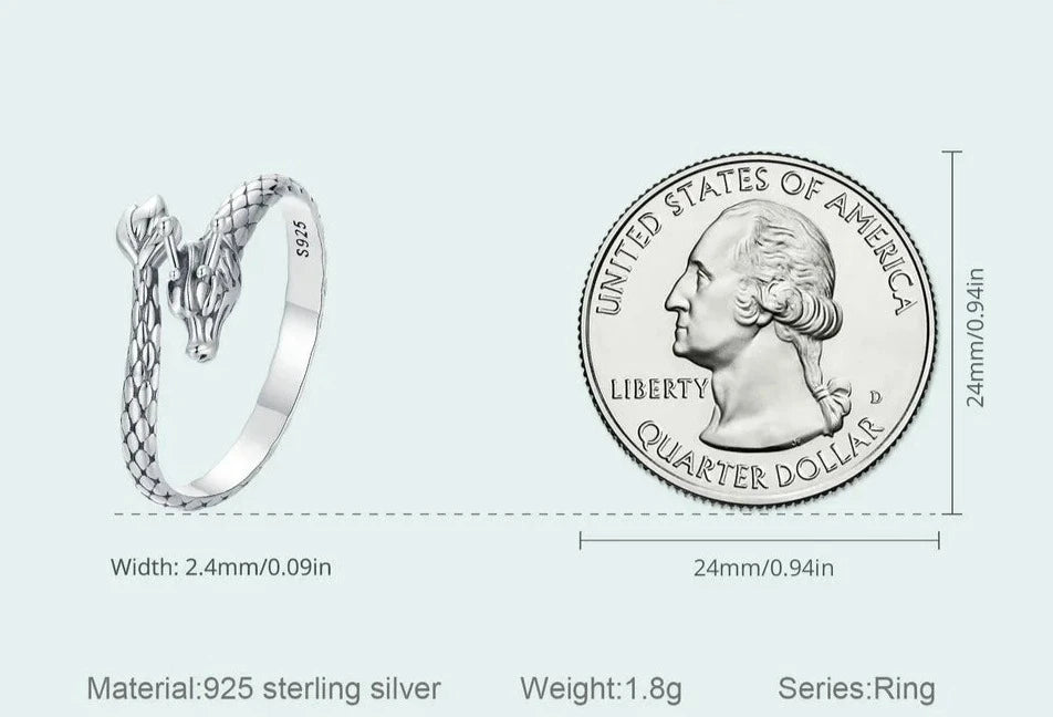 Our Sterling Silver Dragon Ring is a stunning piece crafted from 925 sterling silver, ensuring high quality. It's an open ring designed to fit most finger sizes, with a width of 2.4mm for comfort and style. Featuring an intricately detailed dragon with 3D horns, carved scales, and facial features, this ring exudes an enchanted, gothic charm. The polished, oxidized silver finish adds depth to the design, while the dragon's body elegantly wraps around your finger, making it a captivating accessory for any occasion.