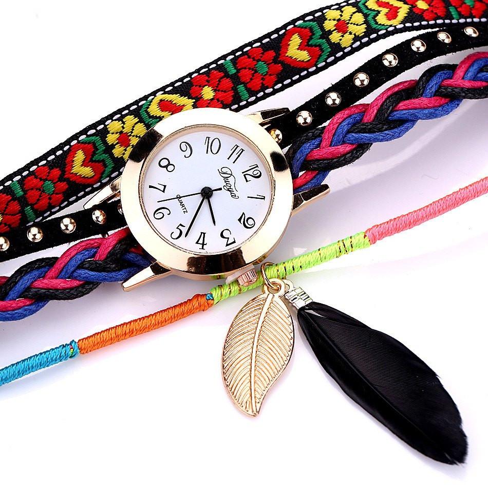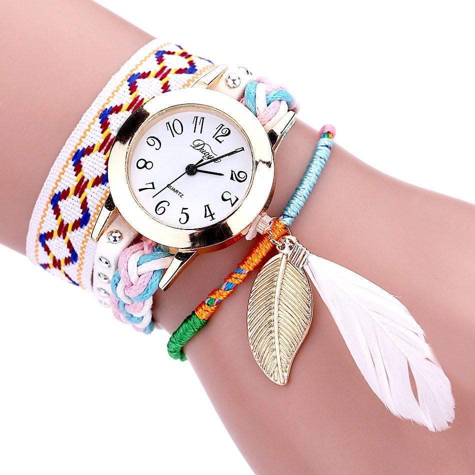 This unique and charming watch features a weave band with a leaf and feather attached to the watch itself. It is also designed in different vibrant colors.