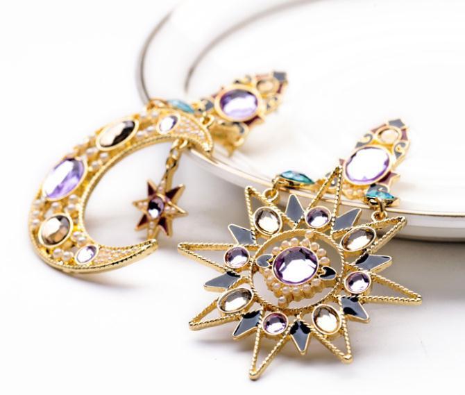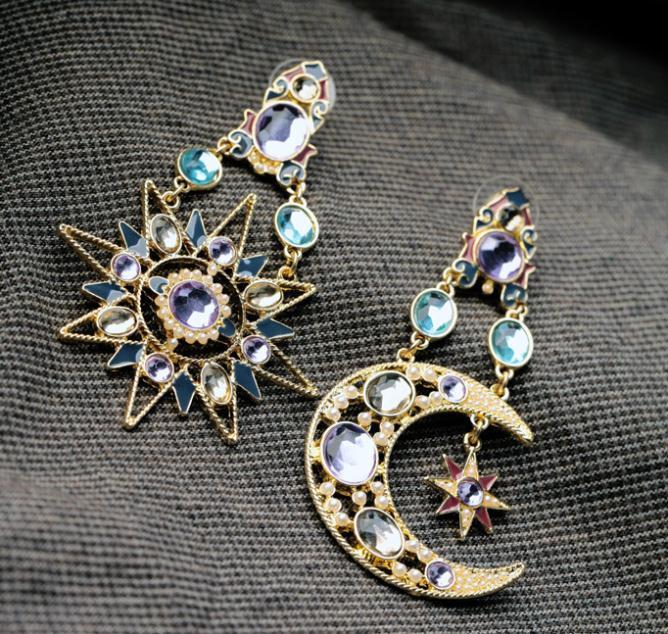 These beautiful drop earrings are asymmetrical and feature sun and moon charms.