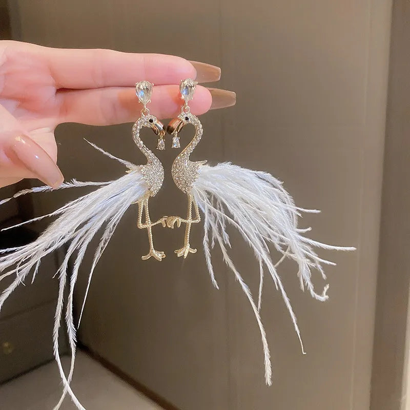 Elevate your style with our captivating Statement Feather Flamingo Earrings. With feather tails, a rhinestone-studded body, and colour options in black, pink, or white, these bird-inspired dangle drop earrings add a touch of elegance and charm to any look.