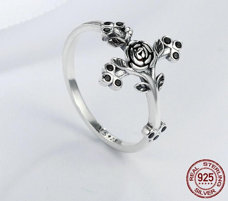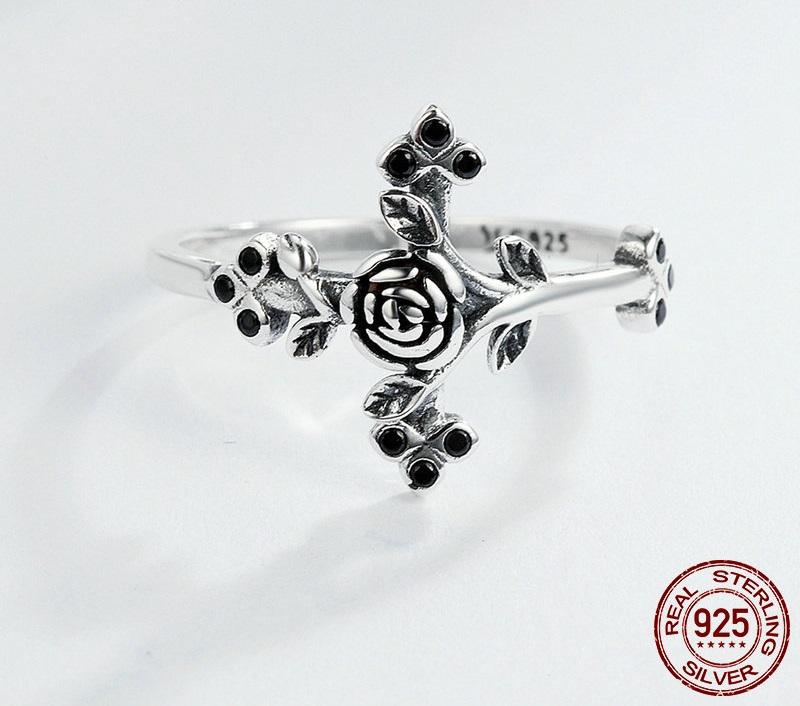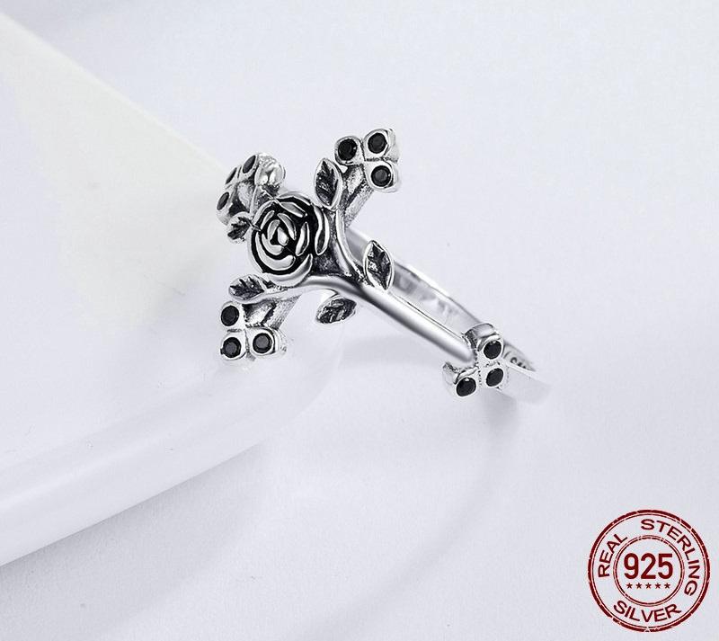 This romantic and enchanting ring features a rose flower at the center of a cross.
