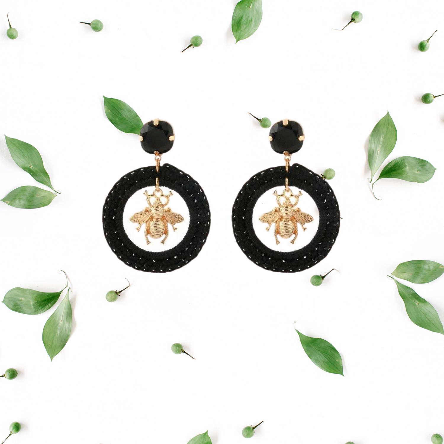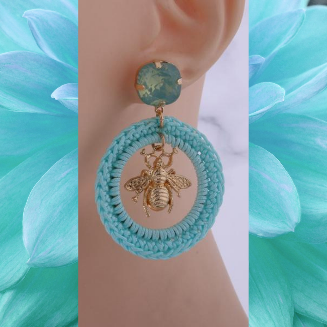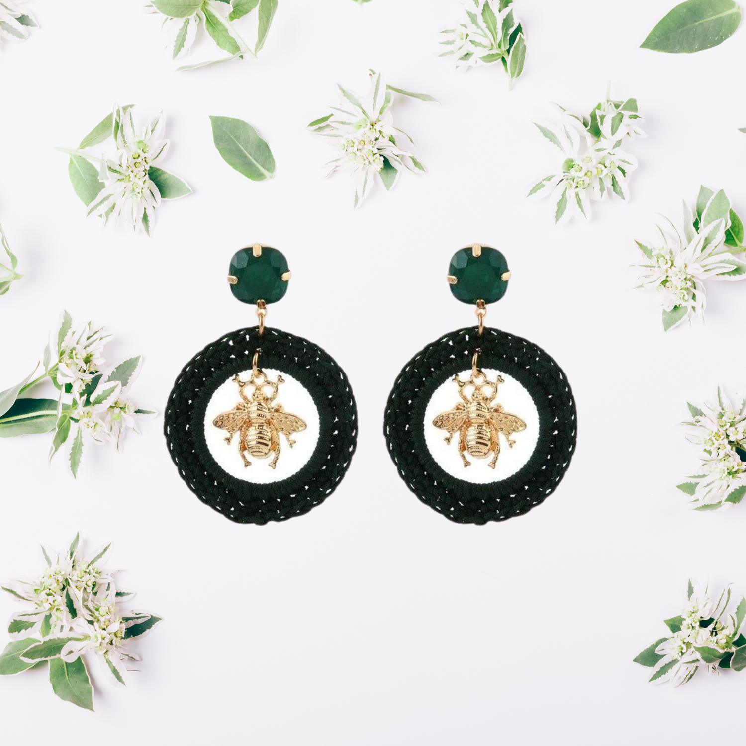 Unusual "bee" drop earrings set either against a plain circle background (grey, green, brown or purple) or in pendulum style within a delicate crochet circle (choice of light blue, black, pink or burgundy).