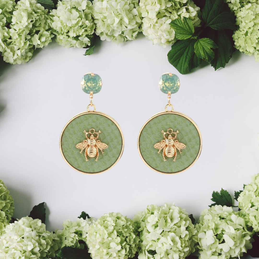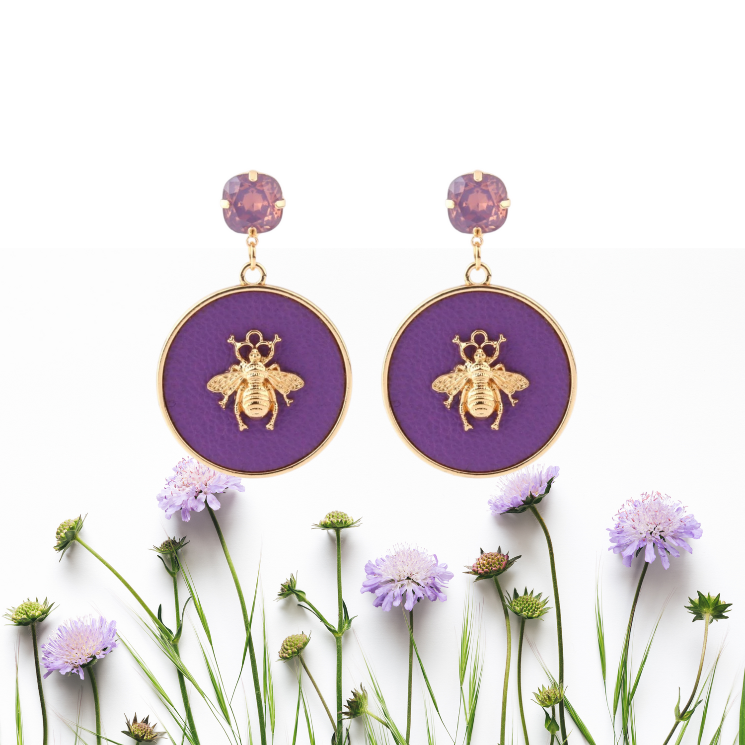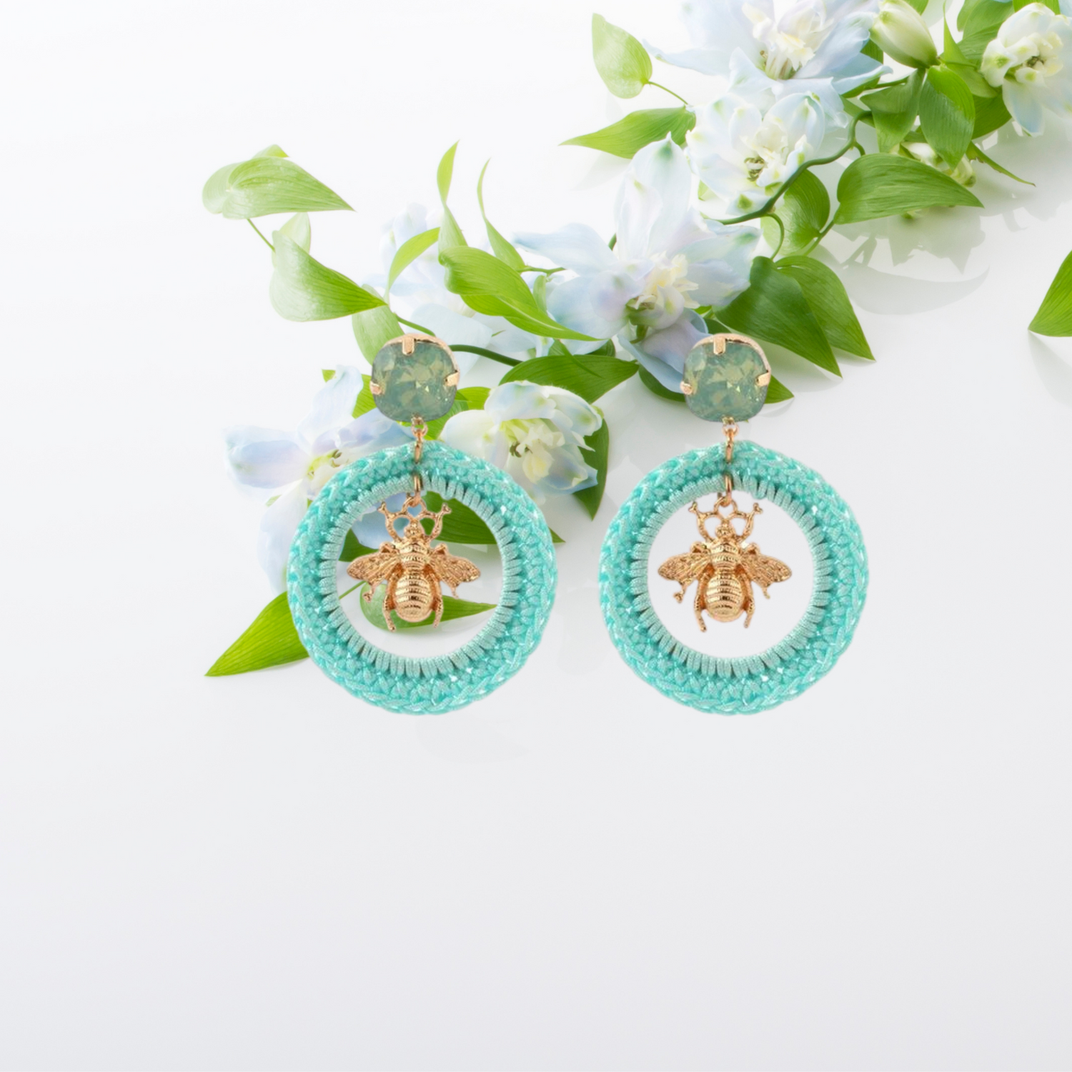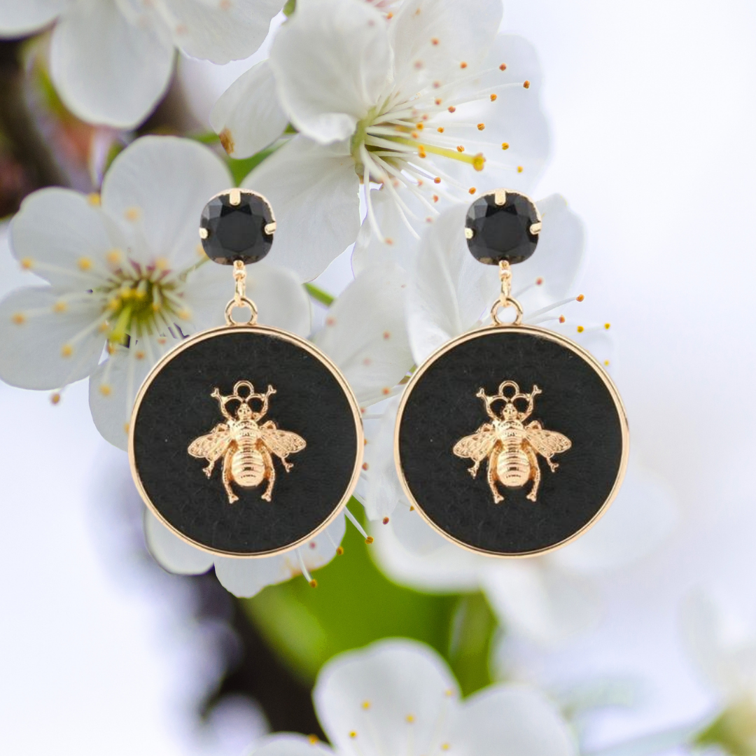 Unusual "bee" drop earrings set either against a plain circle background (grey, green, brown or purple) or in pendulum style within a delicate crochet circle (choice of light blue, black, pink or burgundy).