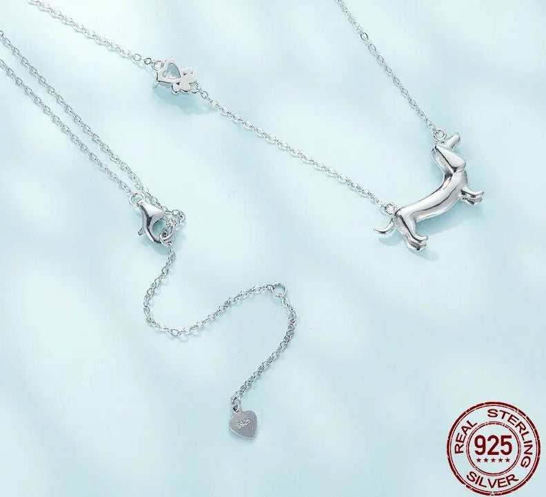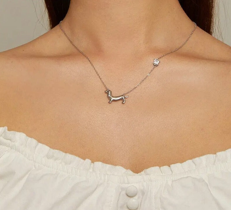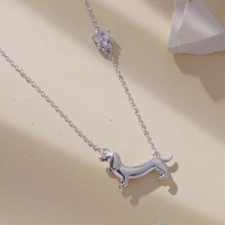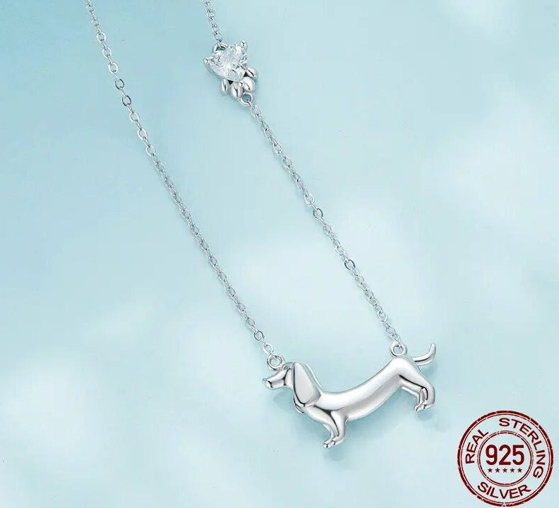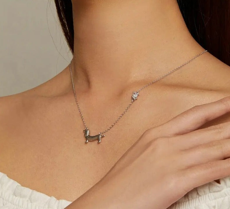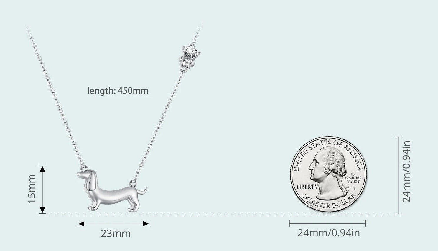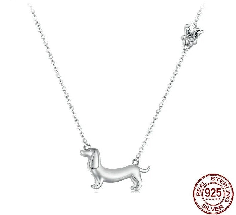 A Sterling Silver 3D Dachshund Necklace is a charming piece of jewelry made from 925 sterling silver. This necklace features a pendant in the shape of a Dachshund dog, which is created in a three-dimensional (3D) design. The pendant also features a zircon heart gemstone, which adds a touch of sparkle and elegance to the piece.