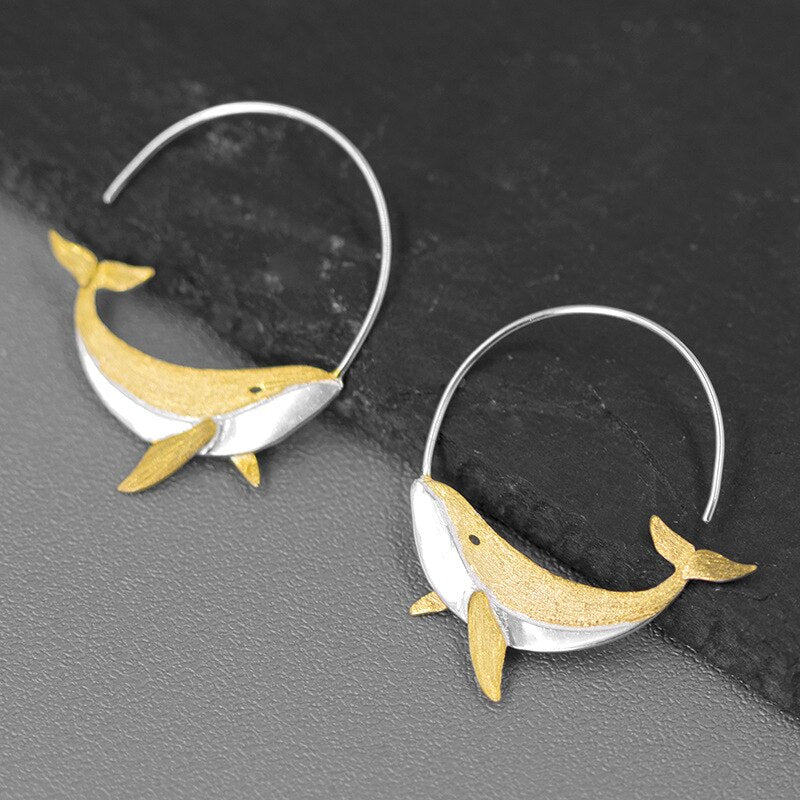 These unique earrings are made with 925 sterling silver and are plated with 18K gold. They feature whales resting gracefully on golden hoop earrings. These stunning, high quality earrings are a great gift for any one who loves the ocean.