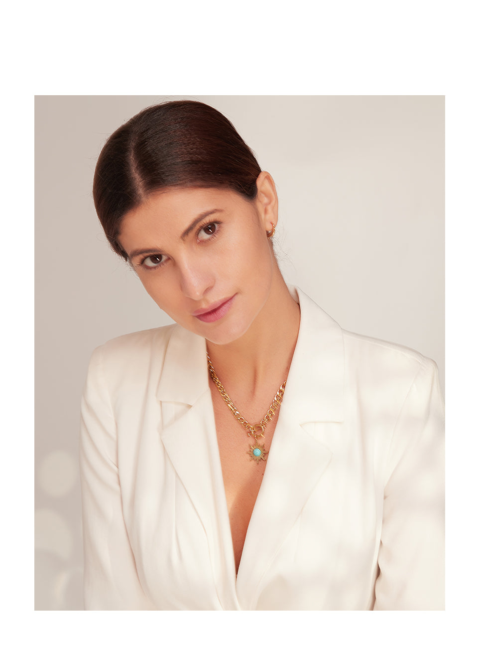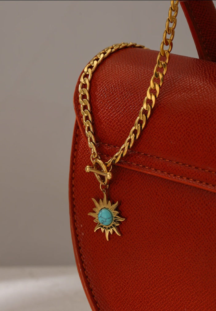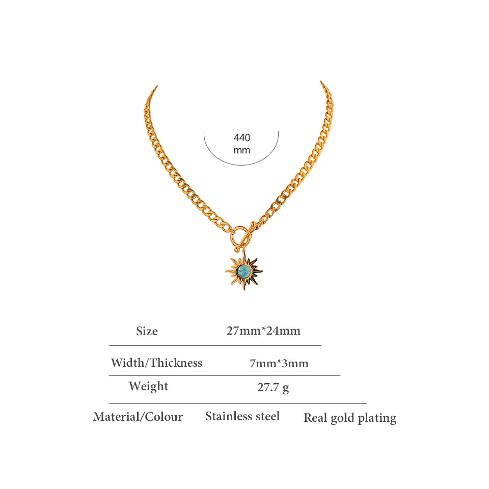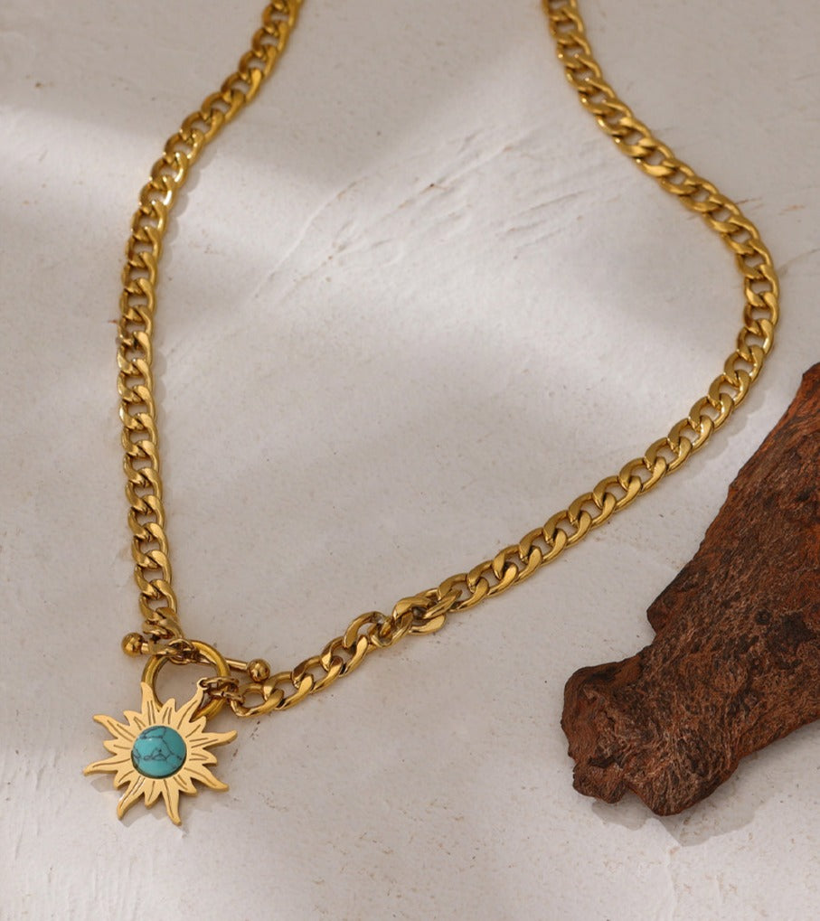 The gold plated sun necklace is a beautiful, one-of-a-kind piece that will not disappoint. This stunning necklace is made of stainless steel and coated with 18K gold plating. At the centre piece is a semi-precious turquoise stone, suspended from a circle and bar fastening. A perfect summer accessory for yourself or a great gift for a loved one.