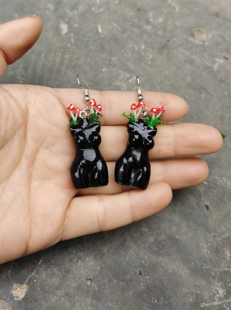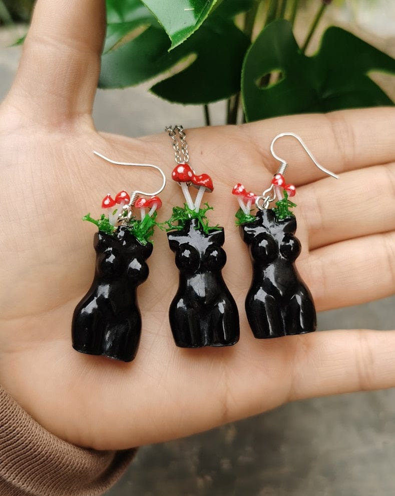 This unique earring and necklace set feature a goddess with mushrooms growing above the torso's neck. Featuring foraged moss, this stunning jewellery set allows you to feel closer to nature. Made from resin. The earring hooks are made from zinc alloy, nickel free and anti-allergy.