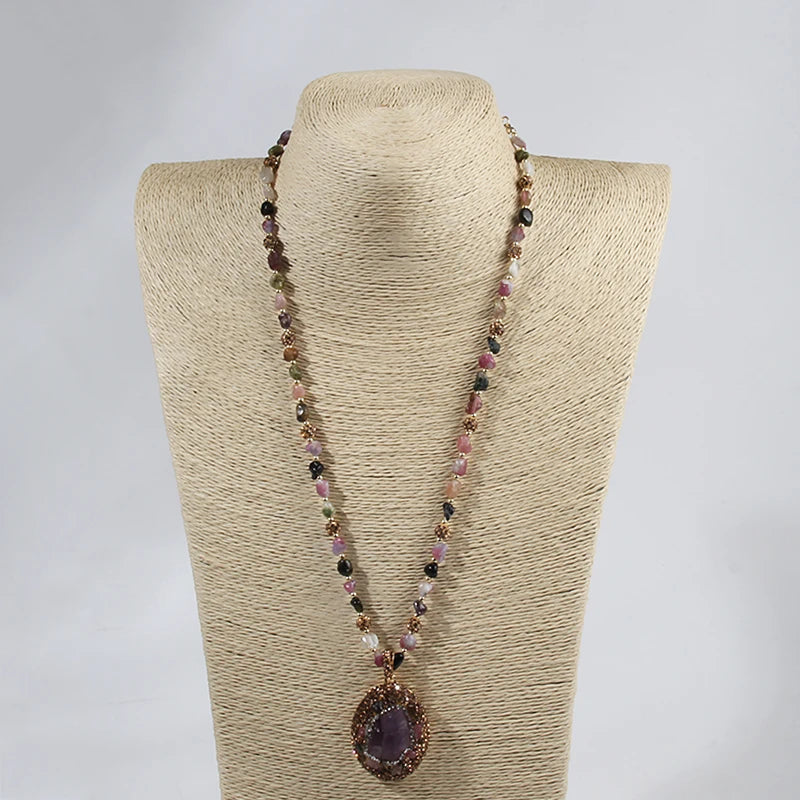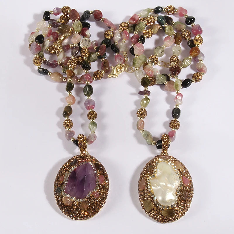 Drape yourself in the rich tapestry of our Baroque Chip Stone Necklace, an embodiment of boho charm and vintage allure. The water drop-shaped Amethyst pendant, a royal centrepiece, adds a touch of regal mystique. Choose between the classic iridescence of pearl or the vibrant hues of Amethyst, each stone exquisitely encrusted. This necklace is a playful symphony of colour, blending the bohemian spirit seamlessly with timeless elegance.