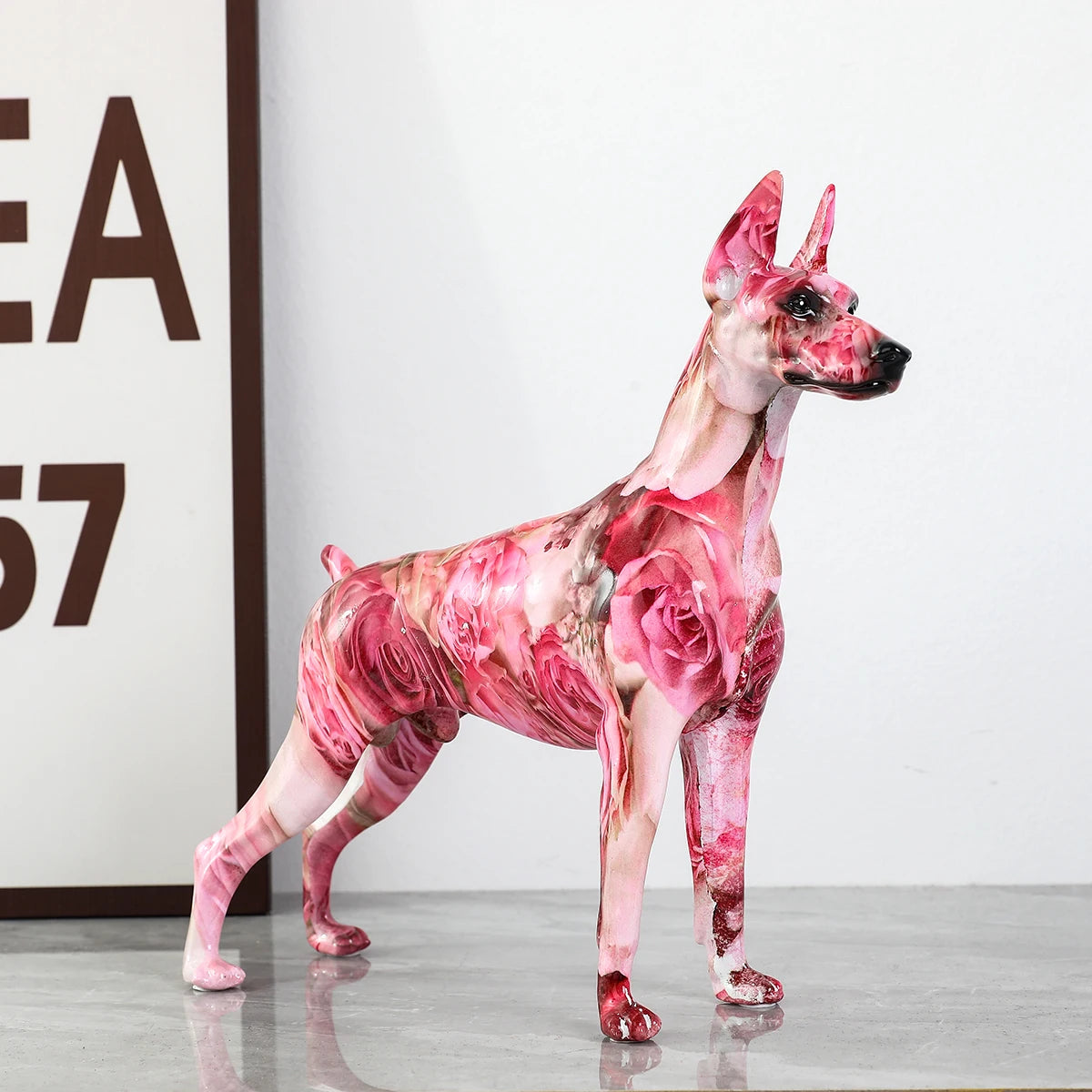 Hand crafted from resin, each modern graffiti style Dobermann is slightly unique.