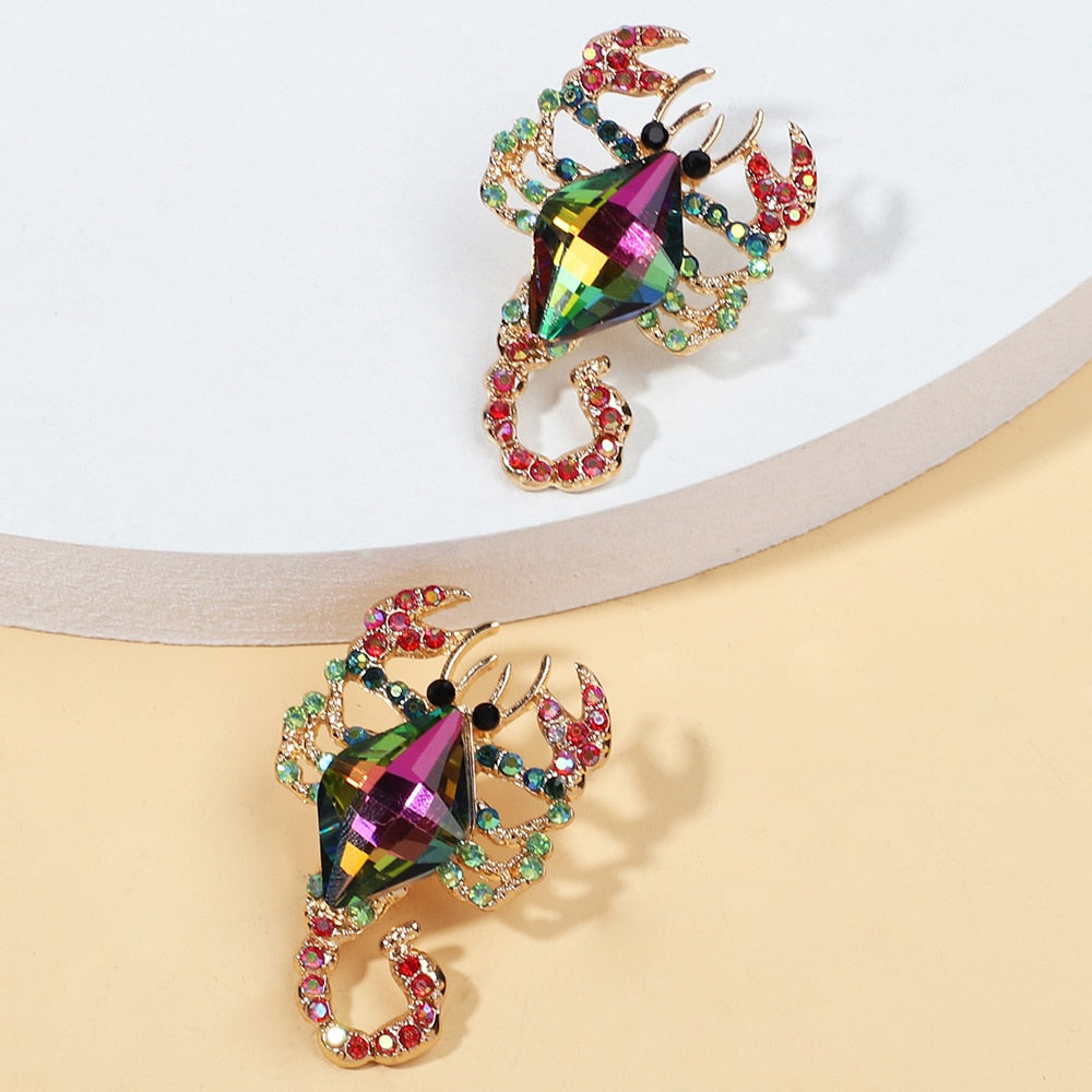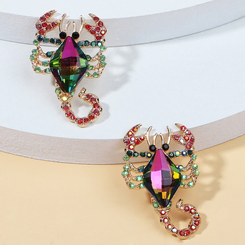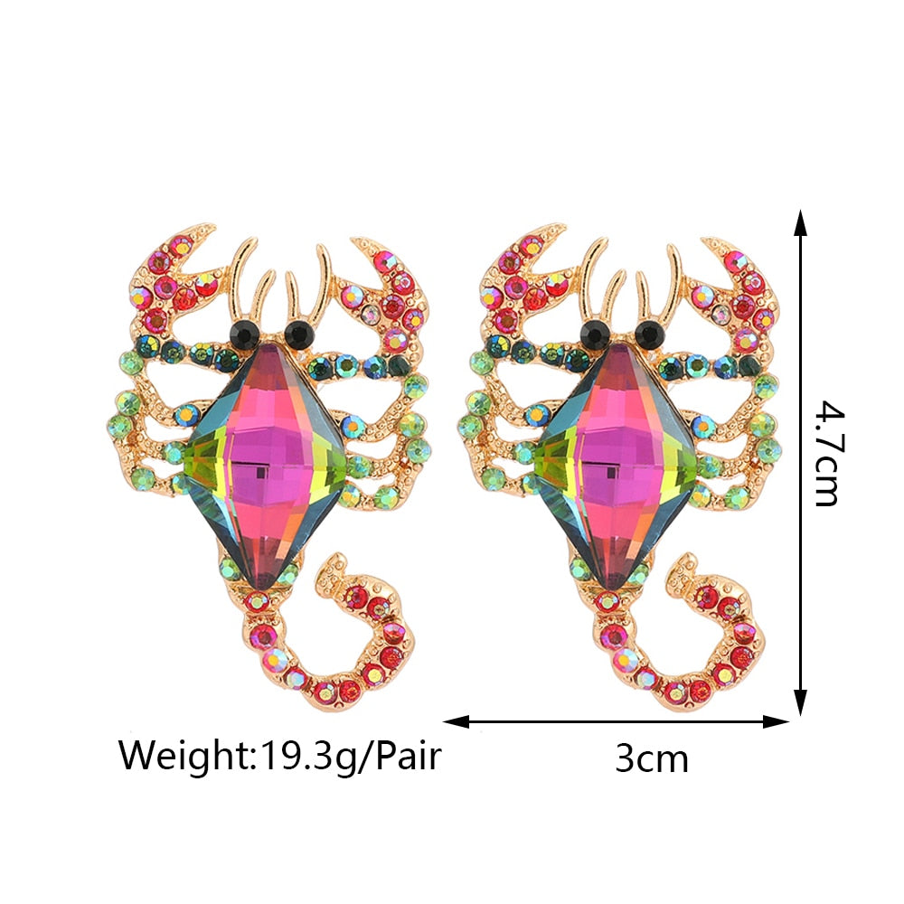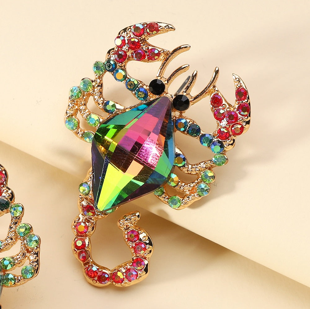 These vibrant statement earrings feature the fierce scorpion in a holographic hue. Encrusted in rhinestones, with the body constructed from glass, these luxury earrings are a great accessory to brighten any outfit. The base of the jewellery is made from waterproof hypoallergenic zinc alloy.