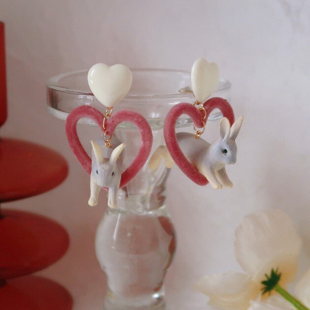 The ultimate kawaii earrings. These adorable earrings feature white bunnies leaping through pink velvet hearts. These earrings add a WOW factor to any outfit. Show off your style and personality with these cute earrings or gift to a loved one.