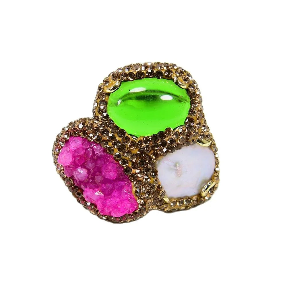 Elevate your style with our Pearl & Agate Druzy Ring. This exquisite piece boasts a harmonious blend of natural elements, featuring a stunning natural pearl, green crystal and rose agate druzy. The adjustable size ensures a perfect fit, and the 3mm surface width showcases the meticulous craftsmanship. With a bezel setting, this ring showcases pink, white, and green semi-precious stones adorned with golden cubic zirconia crystals, creating a mesmerizing combination of colours and sparkle.